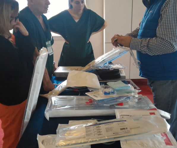 Durante la primera parte del curso, en grupos de 3, los alumnos rotaron por seis mesas en las cuales los instructores les mostraron y explicaron detalladamente los materiales necesarios para realizar drenaje de colecciones, biopsias, punciones, traqueostomias percutáneas, endoscopias, colecistectomías, procedimientos vasculares básicos y radiofrecuencia.